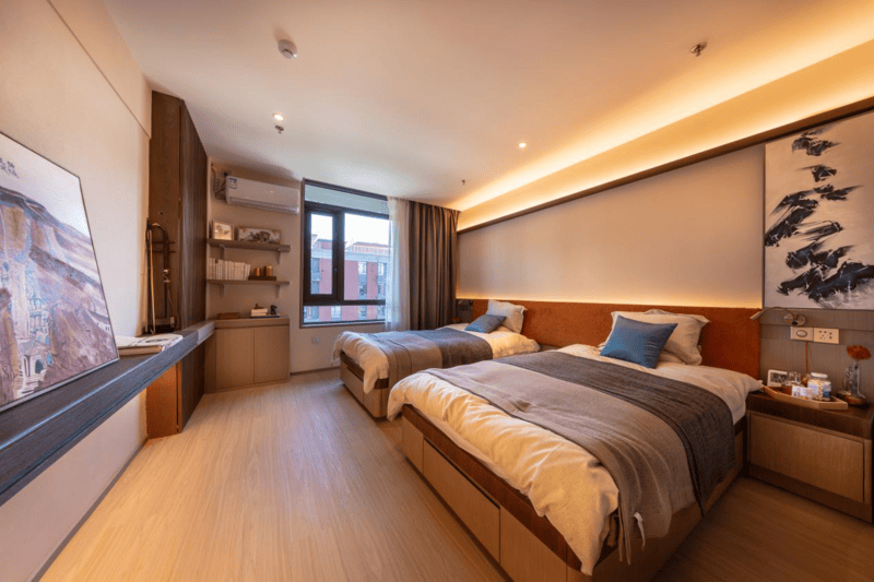 户型设计贴心合理,所有户型均朝阳,采光充足、通风效果好,避免了潮湿、阴暗的问题,长辈住起来更舒适。每个户型都配备独立厨房和无障碍卫浴空间,床榻加宽、床垫软硬适度,家具质感柔和,避免尖锐棱角,从细节处保护长辈的安全;电视、冰箱、空调、电话、专业养老用床、衣柜、写字台等设施一应俱全,还有适老化设计,比如走廊扶手、卫生间防滑、一键呼叫等,全方位保障长辈的生活便利和安全。同时,配备两部医用电梯,确保紧急情况下能够快速转运长辈,保障安全。